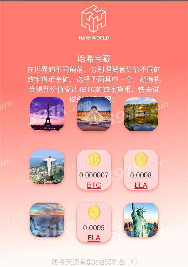 哈希世界每天都有三次抽奖机会,可能会抽中比特币、亦来云、以太坊等数字货币,目前人数还较少,因此收益会比较高。