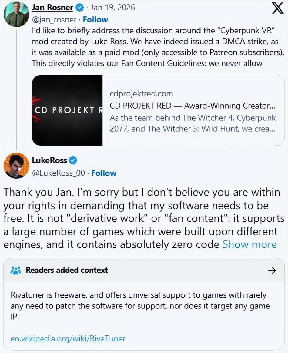 事件的起因是前段时间,CDPR将Luke制作的《赛博朋克2077》的VR MOD强制下架,理由是将其用于商业行为,违反了创作公约。