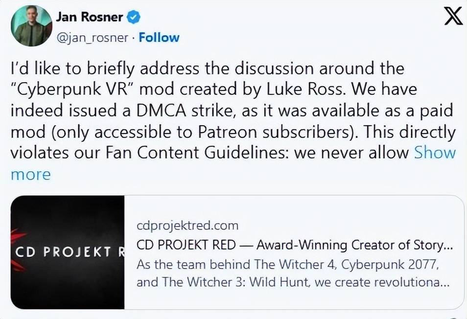 但 CDPR 的态度并非冰冷的一纸通告,CDPR业务发展副总裁Jan Rosner发文表示只要MOD免费,随时欢迎MOD回归。而且他还给了Luke台阶下,大意就是“MOD虽然必须免费,但是你可以开赞助啊,我们甚至可以帮你宣传”。