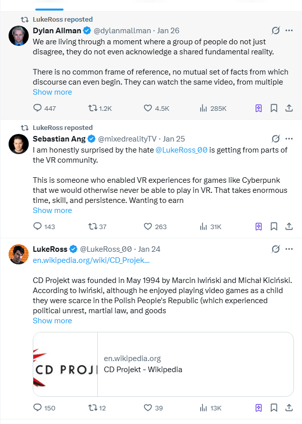 Luke Ross是一名水平很高的MOD开发者,他制作的R.E.A.L. VR MOD解决了大量3A游戏不支持VR的问题,该框架已为40多款游戏提供VR支持,包括《GTA 5》《看门狗》《艾尔登法环》《最终幻想7 重制版》《赛博朋克2077》等诸多大作,可谓是VR界的卡密sama。
