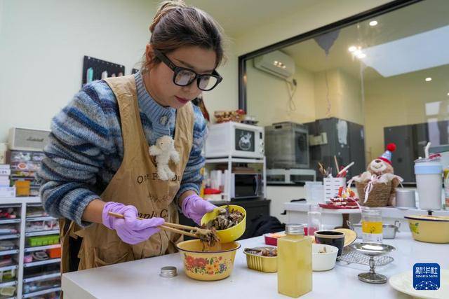 2月3日,在江苏无锡,宠物烘焙师丁一凡在制作宠物年夜饭的样品。新华社记者 李博 摄