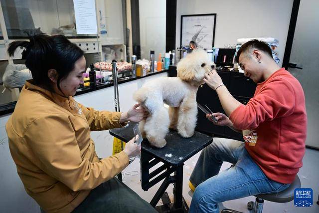 2月6日,在安徽省合肥市一家名叫“极爱宠物”的店内,工作人员给小狗做美容。新华社记者 周牧 摄