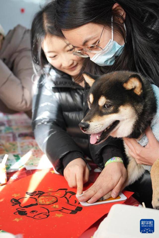 1月31日,在北京市昌平区举行的一场宠物庙会上,宠物狗在福字上拓印爪印。新华社记者 谢晗 摄