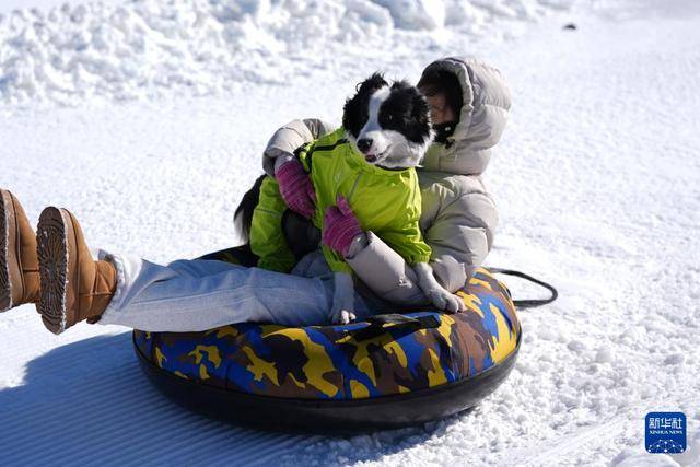 2月7日,在北京渔阳·宠趣里宠物滑雪主题乐园,一名游客带着宠物狗一起坐雪圈参加雪地保龄球趣味游戏。据“宠趣里”乐园负责人介绍,乐园自2025年12月22日开放以来,已累计接待近千只宠物狗。新华社记者 鞠焕宗 摄