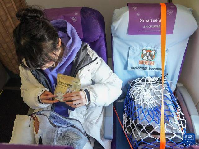 2月3日,在上海飞往成都的HO1059次航班上,夏银穗带着宠物猫“好好”在座位上等候飞机起飞。新华社记者 丁汀 摄